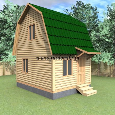 Деревянный дом из бруса 4х5 м2 "Молога" это маленький уютный домик, обычно такие дома строят в садоводствах. Брусовой дома "Молога" несмотря на скромные внешние размеры, достаточно вместительный, и площадей его помещений хватает для летнего отдыха небольшой семьи. На первом этаже садового домика размещается кухня размерами 2 на 4 метра. Остальную часть первого этажа загородного домика занимает гостиная 3 на 4 метра, а в мансардном этаже находится спальня площадью 13,01 квадратных метров (3,5 на 4 метра).