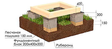 Обычно столбчатые фундаменты применяются при строительстве бань и деревянных домов размерами 6x6м и менее. В стандартном варианте Строительная фирма "Дома и бани из бруса" строит столбчатый фундамент из бетонных блоков 200x200x400 мм, которые соединяются друг с другом цементным раствором. Столбы фундамента укладываются на подушку из песка и подливаются цементным раствором. Гидроизоляция фундамента выполняется из рубероида укладываемого поверх блоков фундамента. Это самый экономичный, простой и быстровозводимый тип фундамента для деревянного дома или бани.